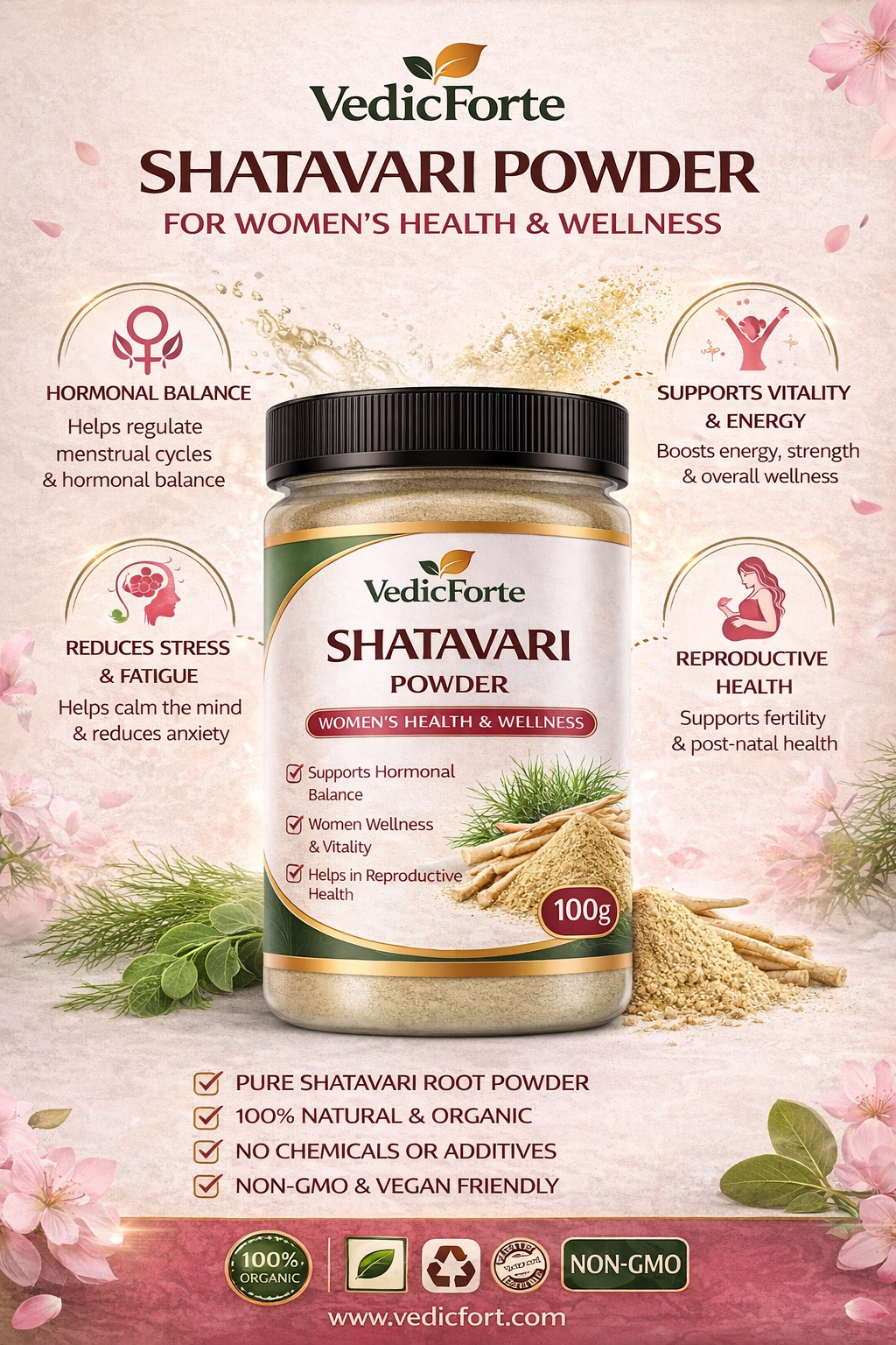 VedicForte Shatavari Powder ek premium Ayurvedic herbal powder hai jo women’s hormonal balance, immunity support aur reproductive health ke liye ideal hai. 100% pure, organic aur chemical-free.