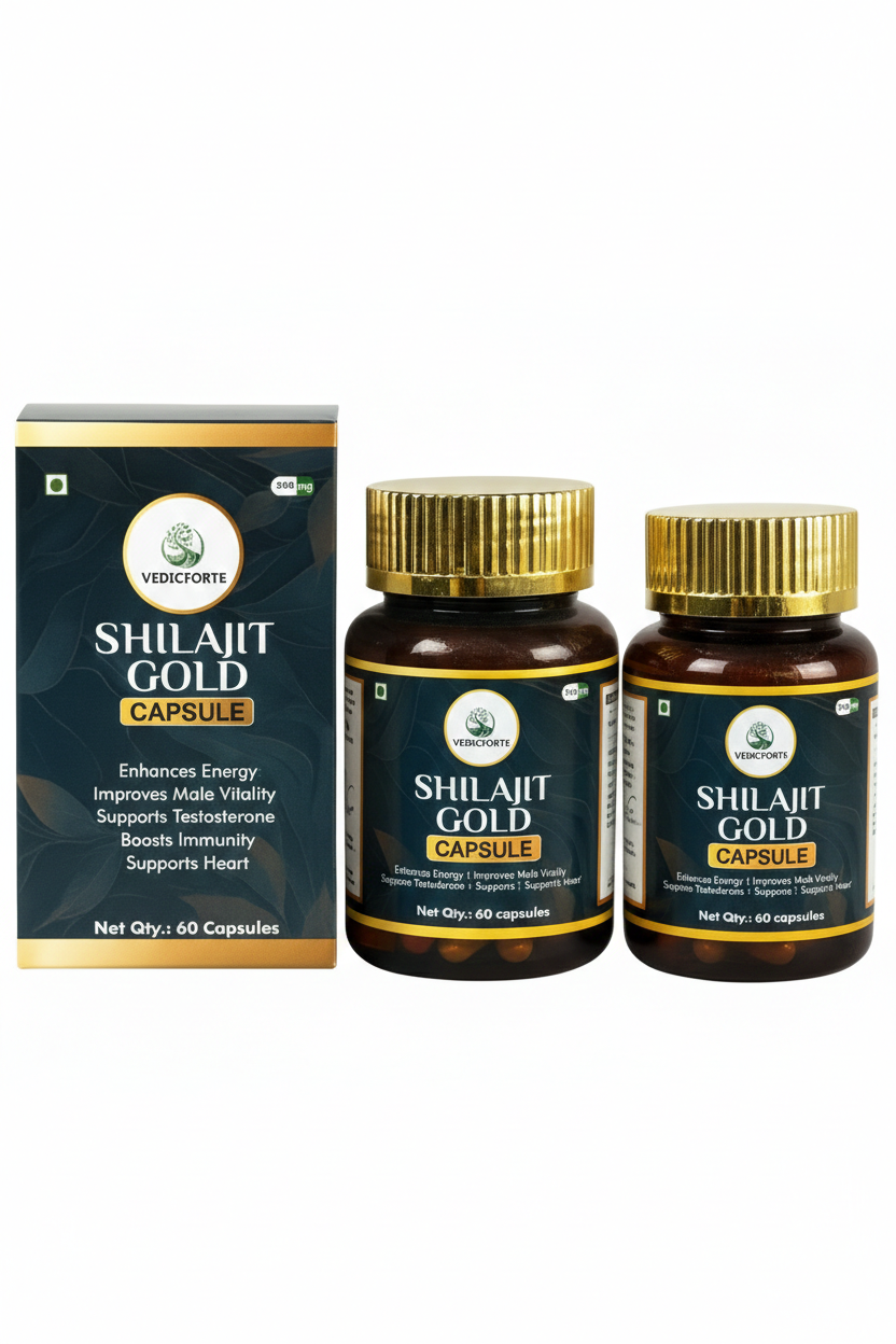 VedicForte Shilajit Gold Capsules (Pack of 2) ek premium Ayurvedic supplement hai jo strength, stamina, energy aur overall vitality ko naturally support karta hai. Regular use se daily performance aur wellness me madad milti hai.